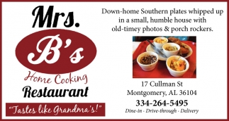 Nov 06, 2022. Mrs. B's Home Cooking Restaurant Restaurants Ads from Montgomery, AL